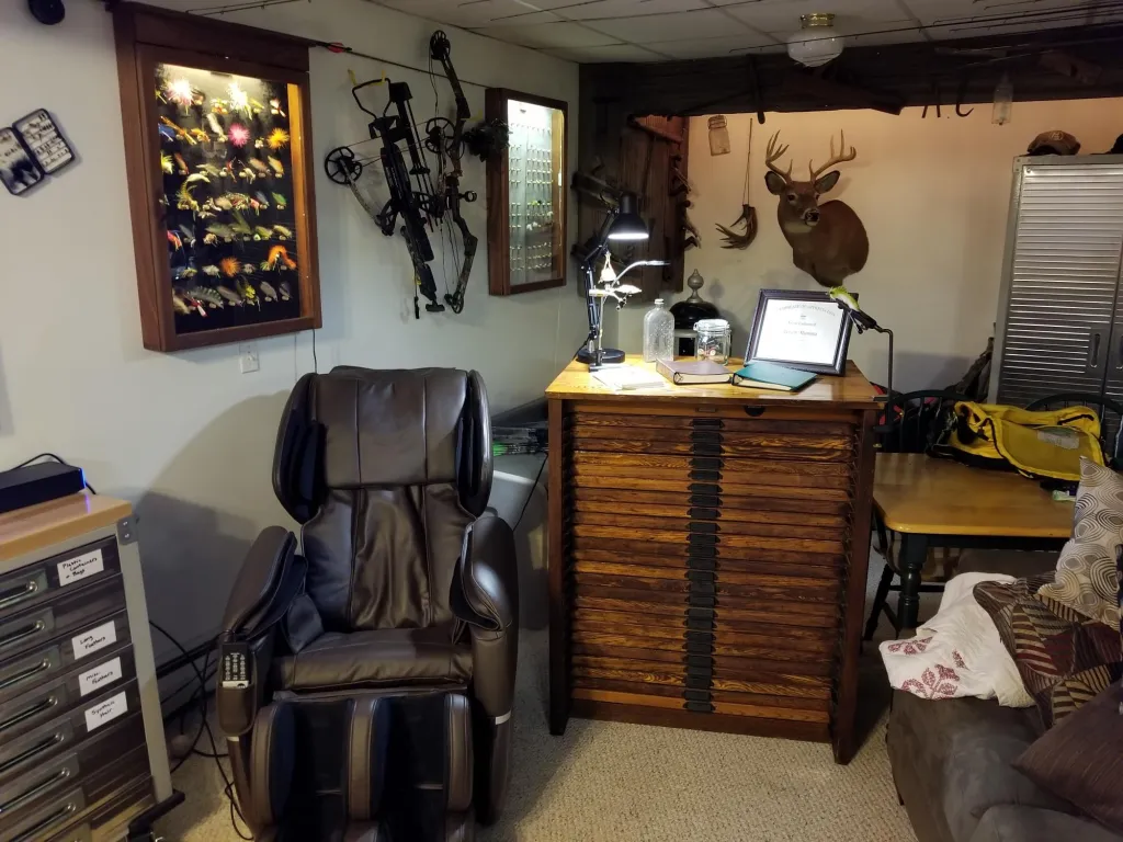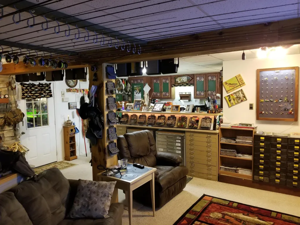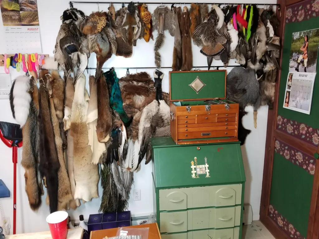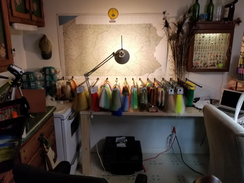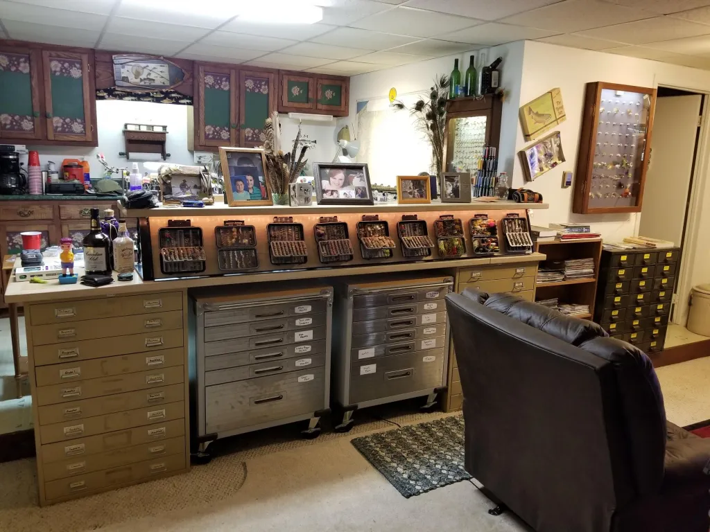 That's quite a setup you have there. I have a few questions for you, first, if you have ever been married, are you still married? Not many women would be so gracious to grant her husband the space, let alone the resources to invest so much into their sport/hobby. Also, I'm assuming this is primarily your tying space and not a museum? That is quite a collection of fly tying tools, materials, and fishing equipment that you have. I would pay money just to see it in person. And my final question is what is your favorite vise, bobbin, whip finishing tool, etc?