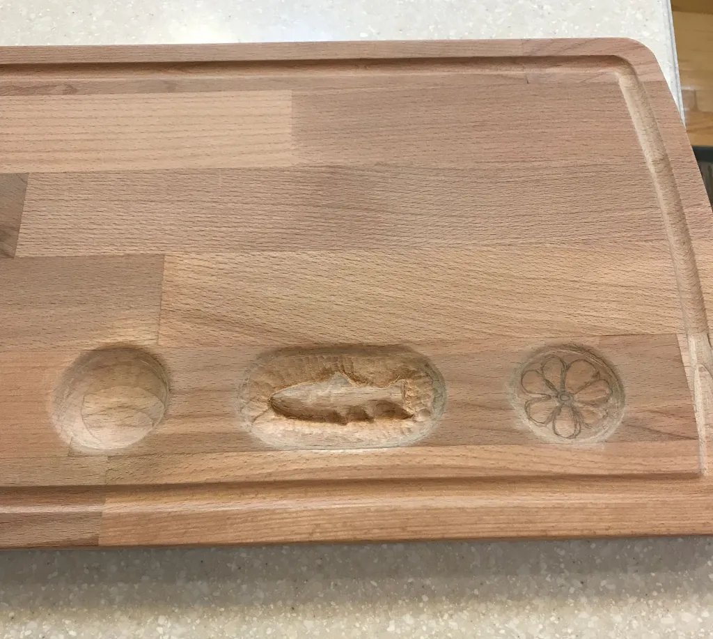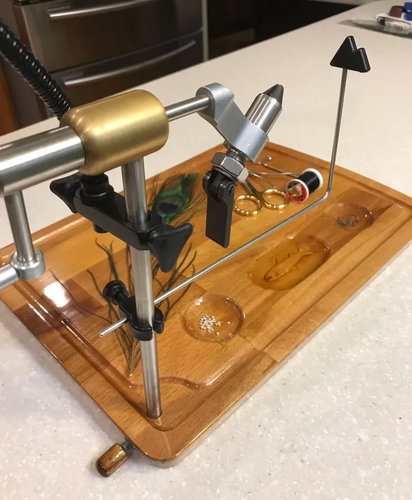 An IKEA cutting board turned lap tying bench with a few rudimentary tools and lost of elbow grease.