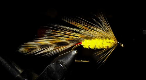 A sample photo of a Golden Olive wet fly taken with no diffuser in place. The light is a little harsh on top of the wing and on the head of the fly, but since the light is so focused on the fly itself, the background darkens dramatically and the fly jumps out of the image. I kind of like this. Care needs to be taken with exposure to ensure the fly is not blown out by the dark background. Always take a few test shots and check before shooting a bunch of flies.