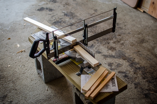Oh yeah - some scrap lumber too. (Gotta love that temporary mid-February workbench). Six pieces of wood are needed in total - three for each stand. One piece for a base, one for the vertical column, and one more for the adjustable boom. Size them according to how you plan to hold the fly during photographs. I made mine so they could shine light down on a fly held in my vise.