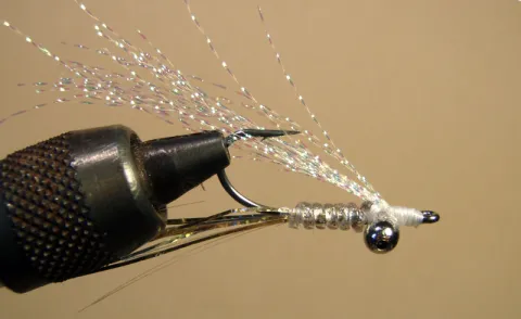 | Body | Clear plastic (V-rib, Larva Lace or similar) over pink Crystal Flash or body braid |