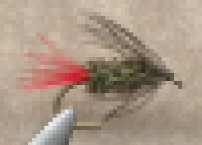 A simple to tie but very effective soft hackle pattern. The Gray Hackle Peacock has taken trout for me in a wide variety of circumstance. A grizzly hen saddle supplies the necessary hackle for the fly. Some folks will use red wool, floss, or other material for the tail, but I prefer the barbules of a bright red hackle. Note the sparseness of the hackle and the length of the barbules in relation to the hook shank.