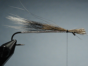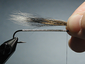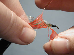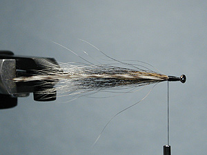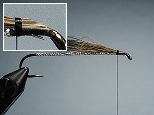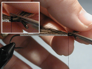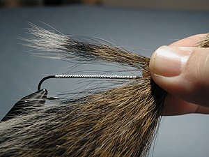 Using a pinch-n-loop, tie the wing down on top of the hook shank. For more on tying hair wings, see this excellent article.