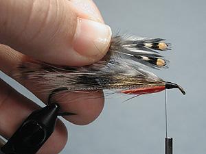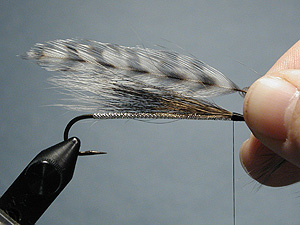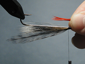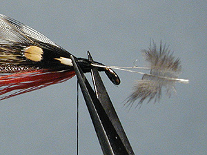 Tie the hackels on top of the underwing. What we're doing now is positioning the feathers, making sure they are vertical, centered with respect to the underwing, and of the proper length.