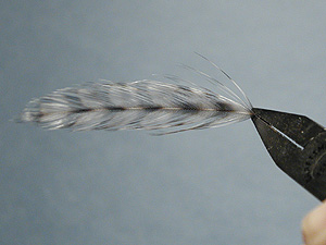 Strip the barbules off the stem below the tie in point. Stripping them not only gives you a clean tie-in point, it also has the affect of flattening the stem, so the feathers are more likely to stand on edge how we want. To ensure this - I crimp exposed stems in a pair of flat nosed pliers. Crimping the feathers at this point can also help the wing hug the top of the body.