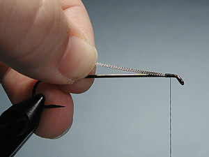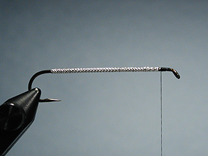 Tie the tinsel along the side of the hook shank with smooth even turns of thread.