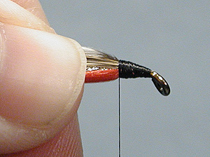 The finished wing is tied in. If it doesn't seem right, unwind your thread wraps and start over. Once you are happy with the wing position, hold the hair with your off hand and bind the wing down with very firm wraps of thread - maximum tension here. Squirrel tail will not flare, so you don't have to worry about it flaring up high, but it is slick and oily and can slip out of position if it is not tied in very tight. A drop or two of your favorite penetrating head cement is not a bad idea.