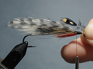 Measure the eye to length and pull back the bottom fluff. We want the jungle cock eyes to be less than the length of the throat. Remember - these are eyes - so keep them in proportion to the rest of the streamer and don't let them get too far from the head of the fly.