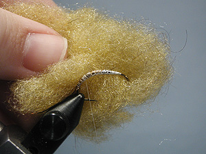 Trim a point in the end of a piece of shellback material so that, once tied in, the material stradles the hook with equal portions of the material on each side.