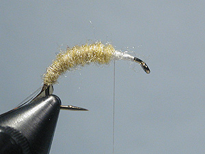 Dub the abdomen such that 2/3's to 3/4's of the body is covered. Since the underbody of the fly already has a tapered shape, there is not need to intentionally taper the dubbing amount on your thread. Try to maintain a consistent sparse amount of dubbing, avoiding lumps and bumps in the body.