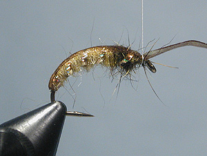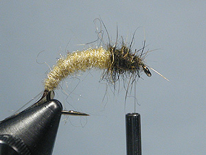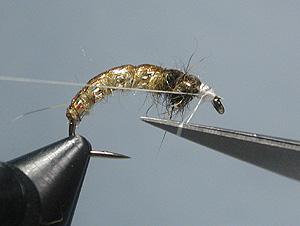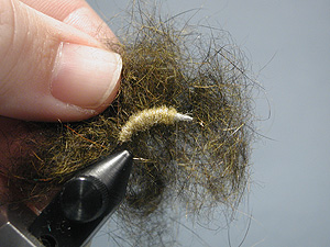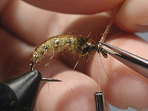 For the throrax, a spikey dubbing that has a contrasting color will not only help you create the illusion of movement and legs, but many caddis and other underwater critters are darker in the throrax/head area. In this case, I'm using a bit of dark olive squirrel, which dubs beautifully and lends itself to "picking".