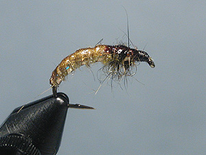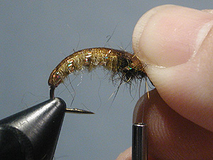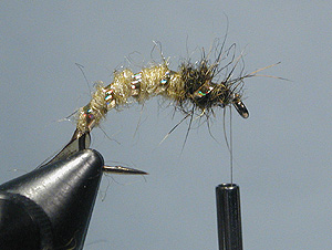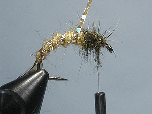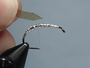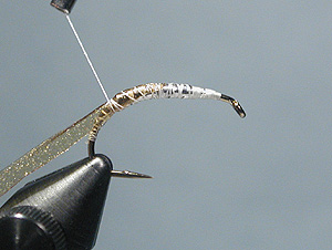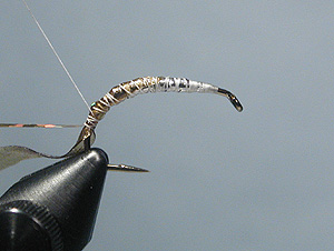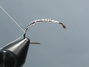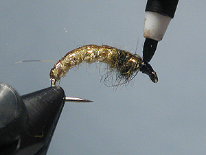 If you were so inclined, you could color the entire dorsal surface with the marker, not only highlighting the segmentation created by the monofilament ribbing, but also giving the finished fly a dark top over a light bottom which is so common in this stage of an insect's life.