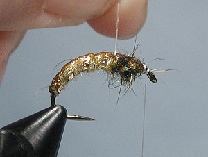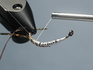 Bring your ribbing tinsel forward in an open spiral. Take care not to space the wraps too closely. The rib is just an accent - a bit of sparkle and flash in an otherwise drab fly.