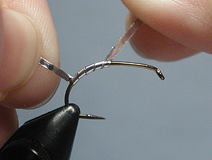 Begin to wind the monofilament ribbing forward, taking care to keep the wraps somewhat in the middle of the flat tinsel wraps. If you wrap softly then pull up strongly on the near side (assuming right handed tyer), there is less chance of shifting the shellback than if you wrapped over the shellback with high tension.