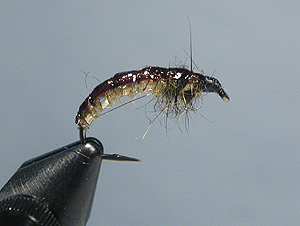 Shellback is the common name for a tranlucent, rubbery material, which is used for shells and similar parts of nymphs and shrimps. It comes in sheets as well as in narrow strips and is often adhesive on the backside. You wind it as shown on this fly or tie it in as a shell on the back of other patterns, typically securing it with the rib. It normally stretches quite a bit.
