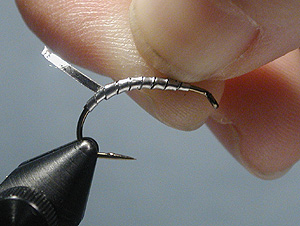 For most Czech nymphs, there are two ribs. One that is goes underneath the shellback, and one that goes over the shellback to create the segmentation. A bit of tippet material is the perfect choice, since it can be wrapped with strong pressure yet practically disappears in the final fly. Pick a size that is thin yet strong. 5x seems about right.