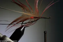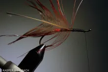In the river Spey on Scotland, I had seen how delicate a long and sparse spey hackle pulsated in the current and after several attempts I found a red body feather from a golden pheasant would do the job.