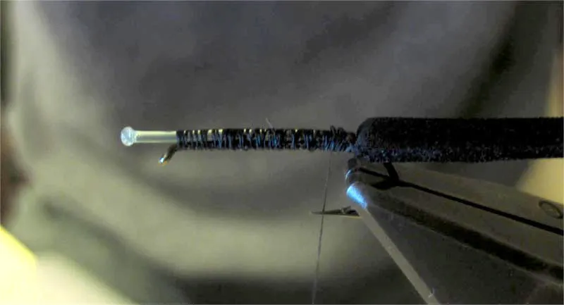 Tie on a piece of thick mono or a piece of weed trimmer cord to extend the hook shank. Melting it in the tip can keep the material in the head from slipping. Tie in a strip of foam in the rear.