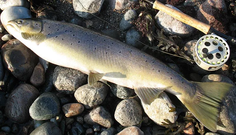 One of the possible prizes of winter fishing for sea run brown trout: large colored fish, either kelts - fish which have been spawning and are regaining their condition in the cold water - or fish on their spawning run like this one. Undamaged fins, tail and abdomen in combination with color is a sign of a pre-spawn fish.