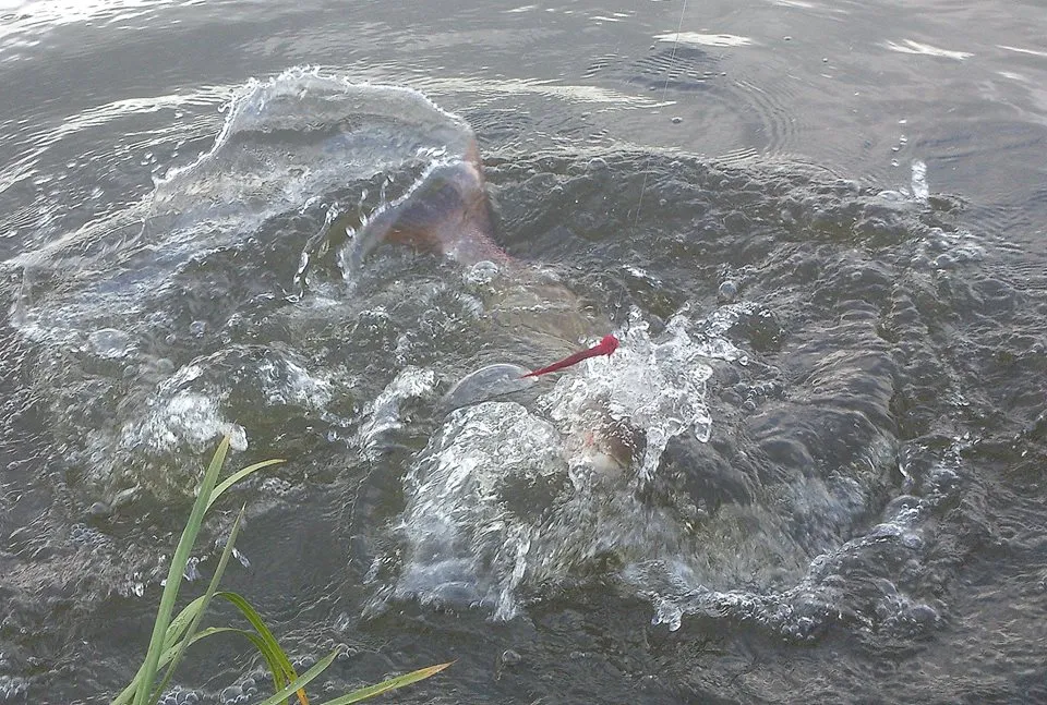 Like most tube flies the Munker will disengage from the hook, and you then avoid the fly working as a lever, loosening the hook. Here the loose fly is clearly seen in a violent splash that could easily have lead to a lost fish. The fish is still well hooked.