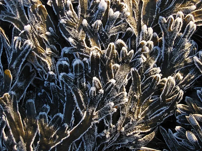 Early morning as the sun comes up, the night's frost hasn't yet lost its grip on the sea weed on the beach.