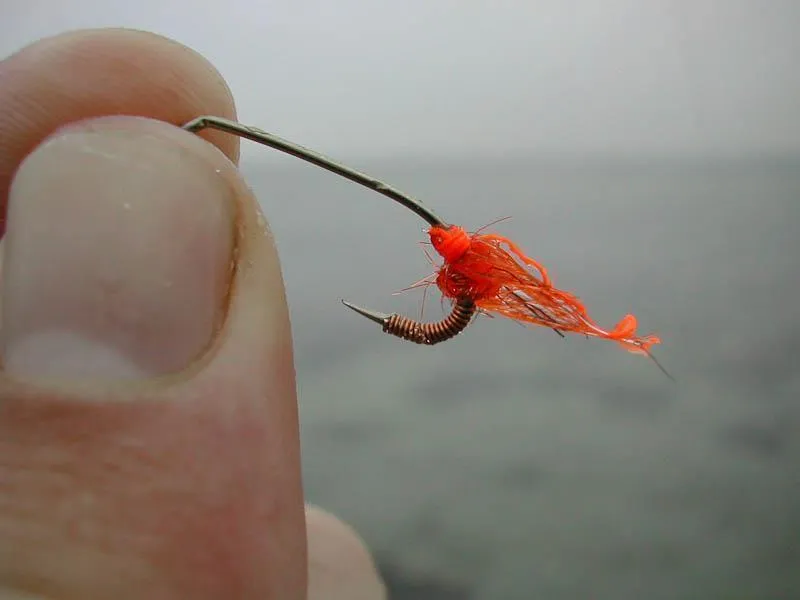 This does not happen in the vice! The newly tied Orange Klympen has broken down. Back to the vice and add some varnish or glue to the pattern!