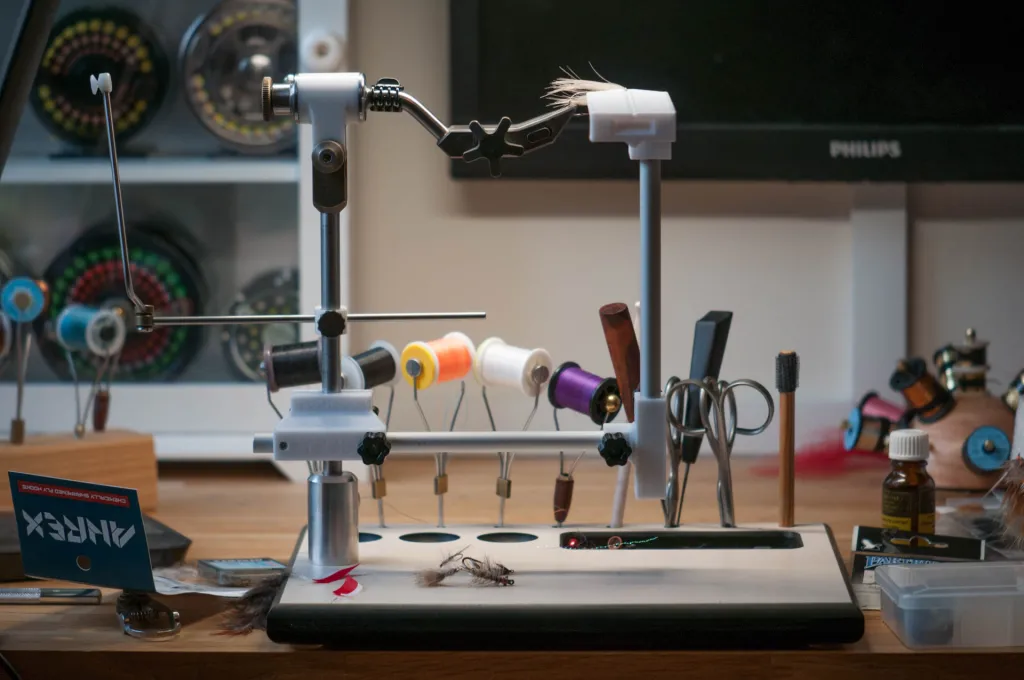 The dubbing brush tool mounts on the stem, and can be adjusted to fit basically any vise.