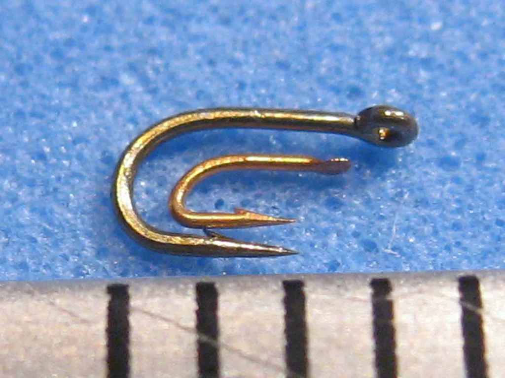 These hooks are both size 32! But as it's quite obvious, the inner one - the Mustad 277 - is MUCH smaller than the outer one - a Tiemco TMC 518. The scale below is millimeters!