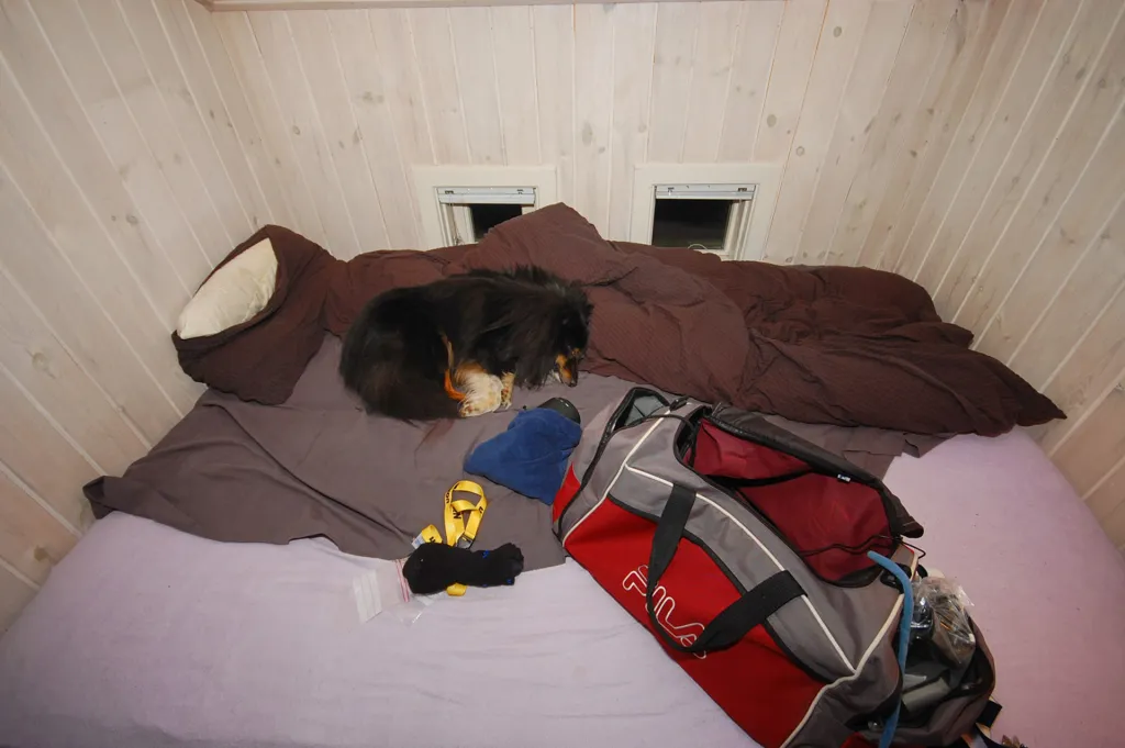 When we're on week long fishing trips in summer houses and cabins, Divus finds it suitable to sleep in the bed with me