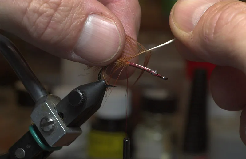 Wind the hackle carefully, stroking back the barbs. Take care not to pull too much. The tied in tip is very fragile