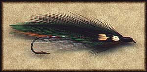 • Throat: white bucktail extending just beyond the bend of hook, then a black silver pheasant crest, and small bunch of blue hackle barbules, both as long as shoulder
