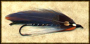 • Wing: 6-8 strands of peacock herl, over which are two orange saddle hackles, flanked on each side by a dark blue saddle hackle.