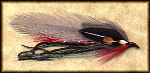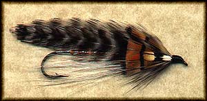 • Wing: 5-6 strands of peacock herl, over which are two orange saddle hackles, flanked by two black saddle hackles of equal length