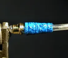 After the glitter is dry then I add the ribbing, in this case in the grooves cut into the tube, I used metallic silver thread for this process. After several unsuccessful attempts to add ribbing I hit upon the idea of double wrapping the thread in the groove and finishing with a single overhand knot to hold it in place. I applied head cement to the knot, let dry and trimmed the excess thread. If satisfied I then epoxied the complete body and let dry.