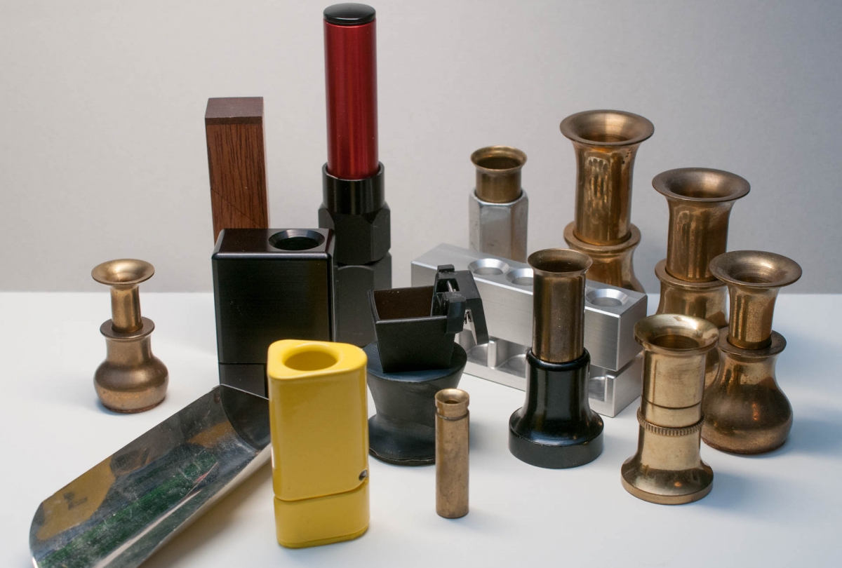 The metal stackers can vary from tools turned in solid brass or aluminum, even steel to cheap rolled-up, soldered metal plate.
